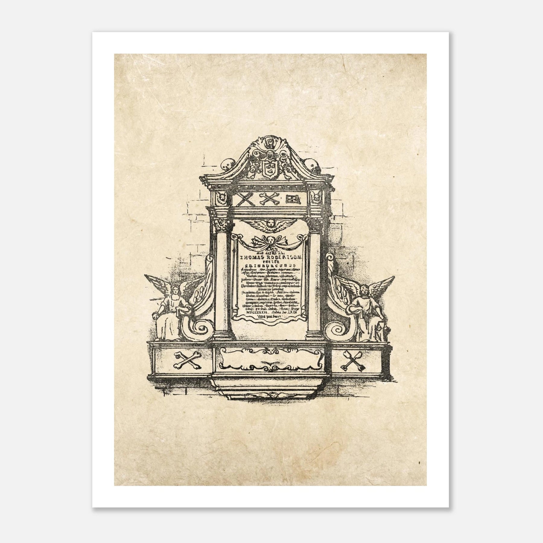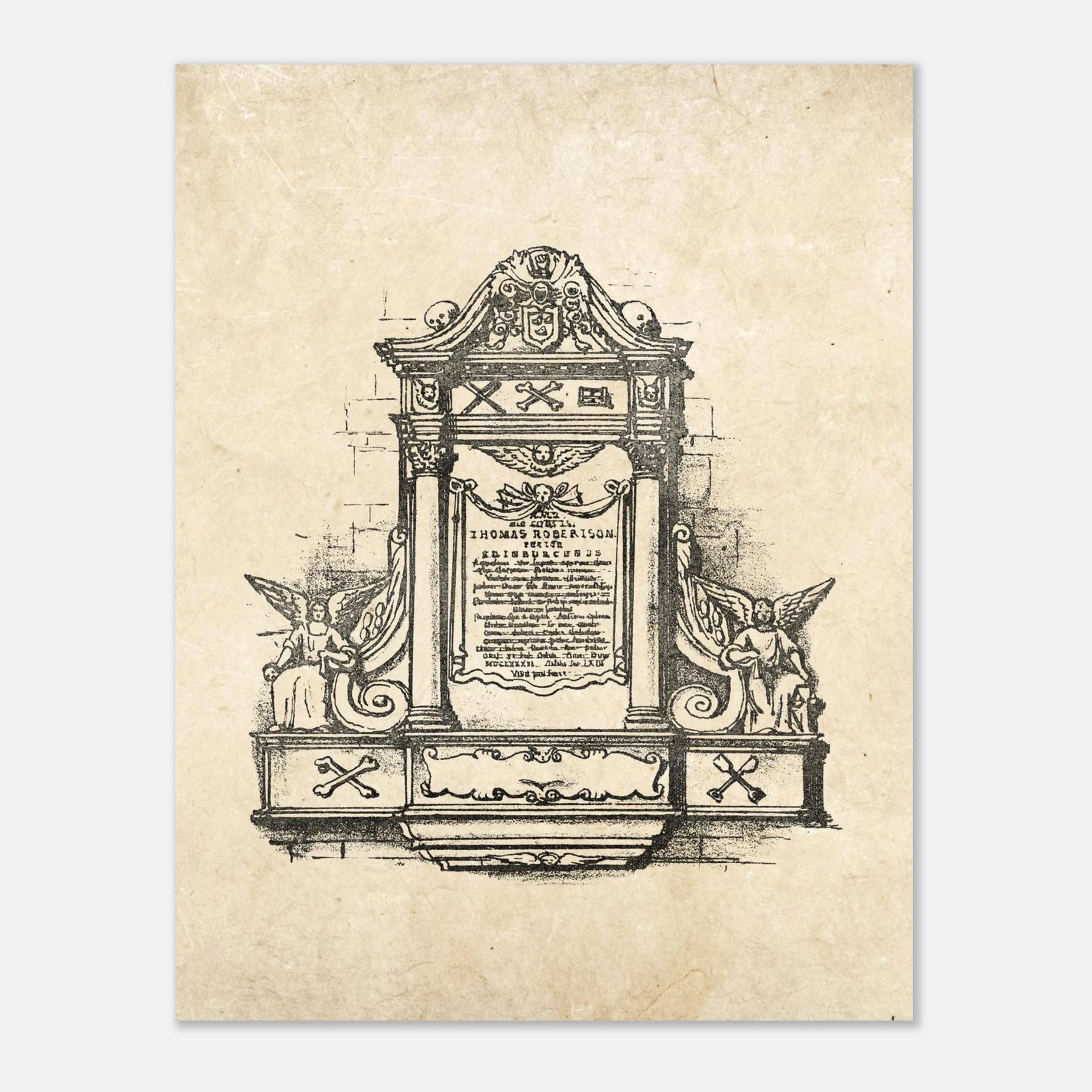 An illustration of the grave of Thomas Roberts, from the book "The Epitaphs and Monumental Inscriptions in Greyfriars Churchyard, Edinburgh. Collected by James Brown. Keeper of the Grounds" c. 1867.