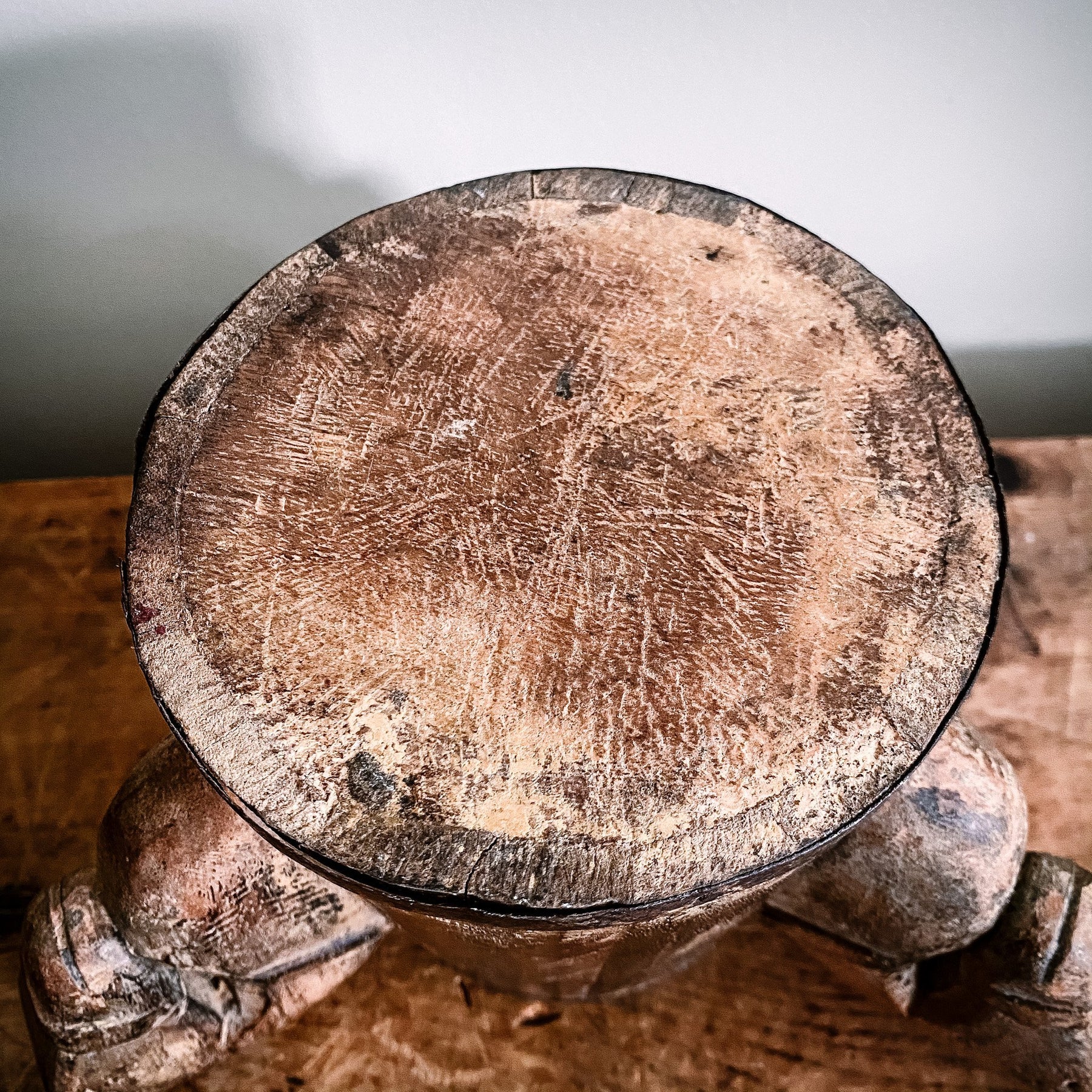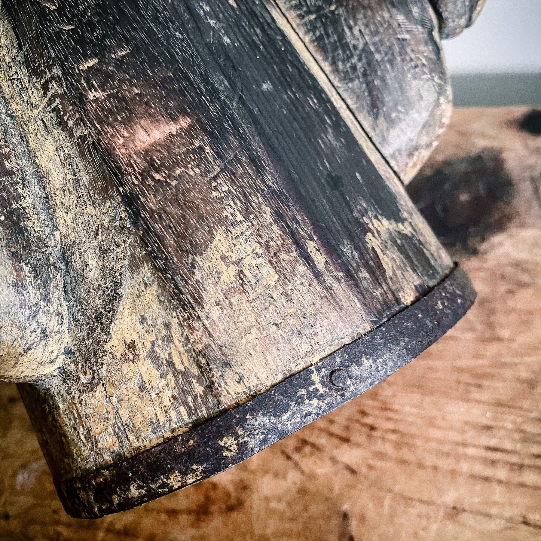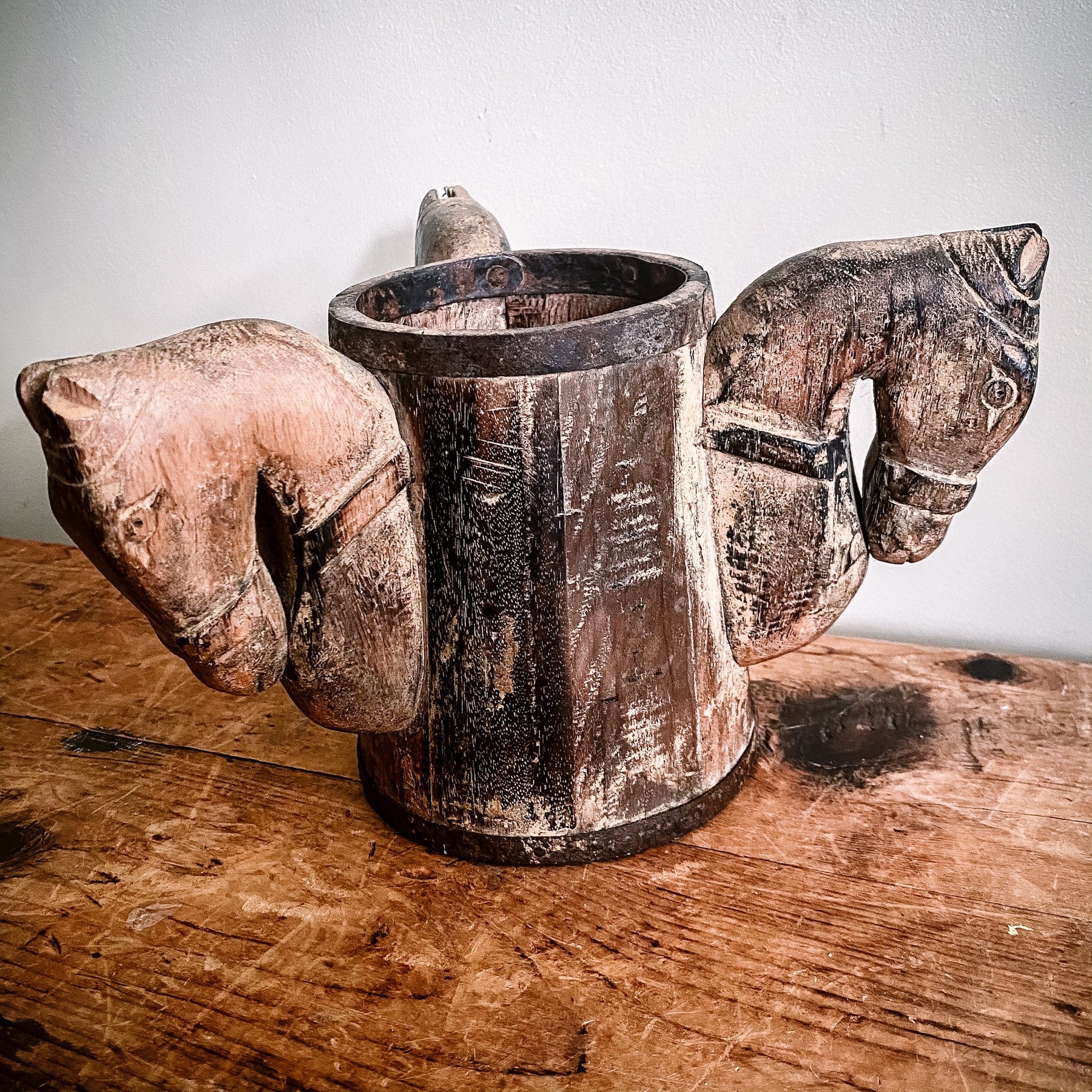 A stunning figural tankard, believed to be 18th century Scandinavian, featuring three horse head handles. Birchwood with metal hoops. The horse heads have a primitive execution giving them a characterful appearance, and the entire piece has a wonderful patina, especially worn in particular areas from centuries of use. A fantastic decorative piece that can stand alone or be reutilised as a vase, small storage container, etc.