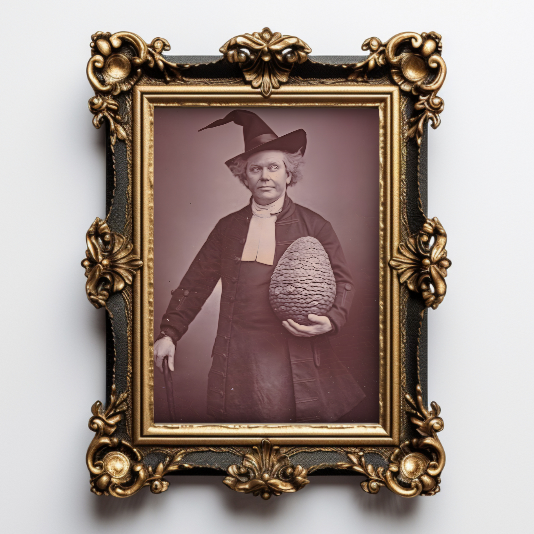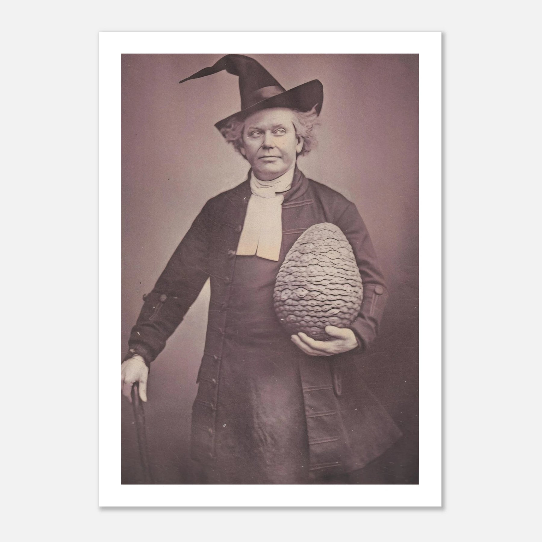 A photograph showing Archibald Merriweather, a noted and somewhat unscrupulous merchant of magical creatures, cradling a dragon egg. Local lore says that the egg hatched two days later, setting fire to the roof of the local pub.
