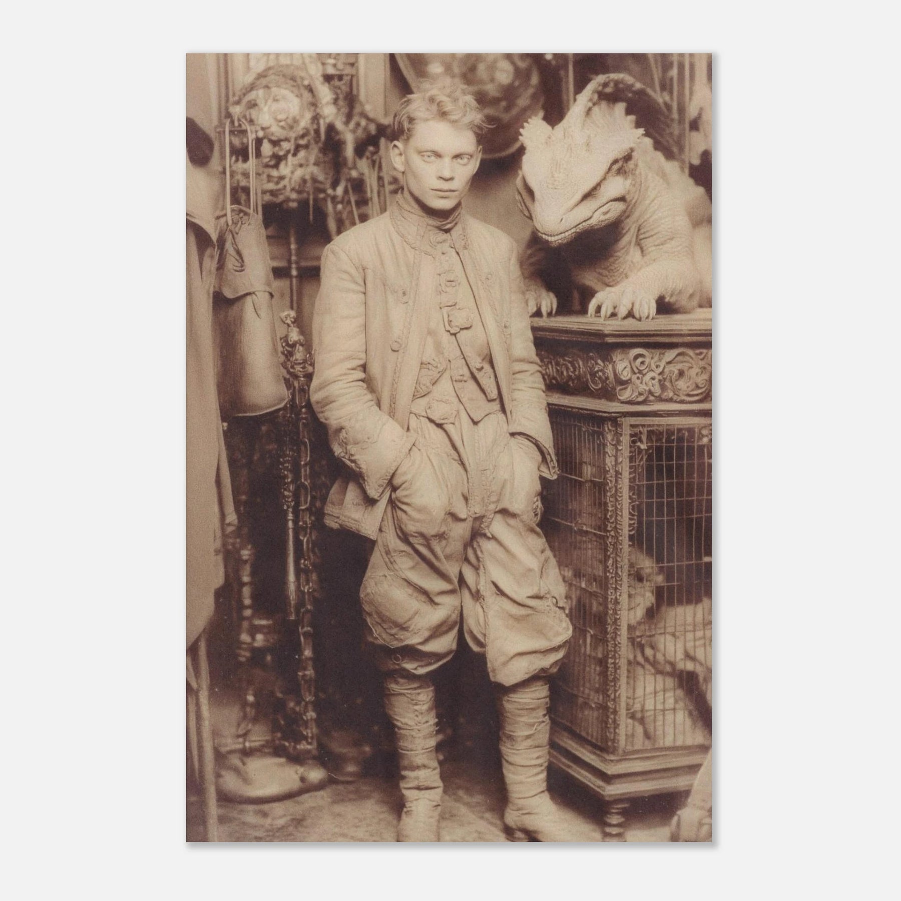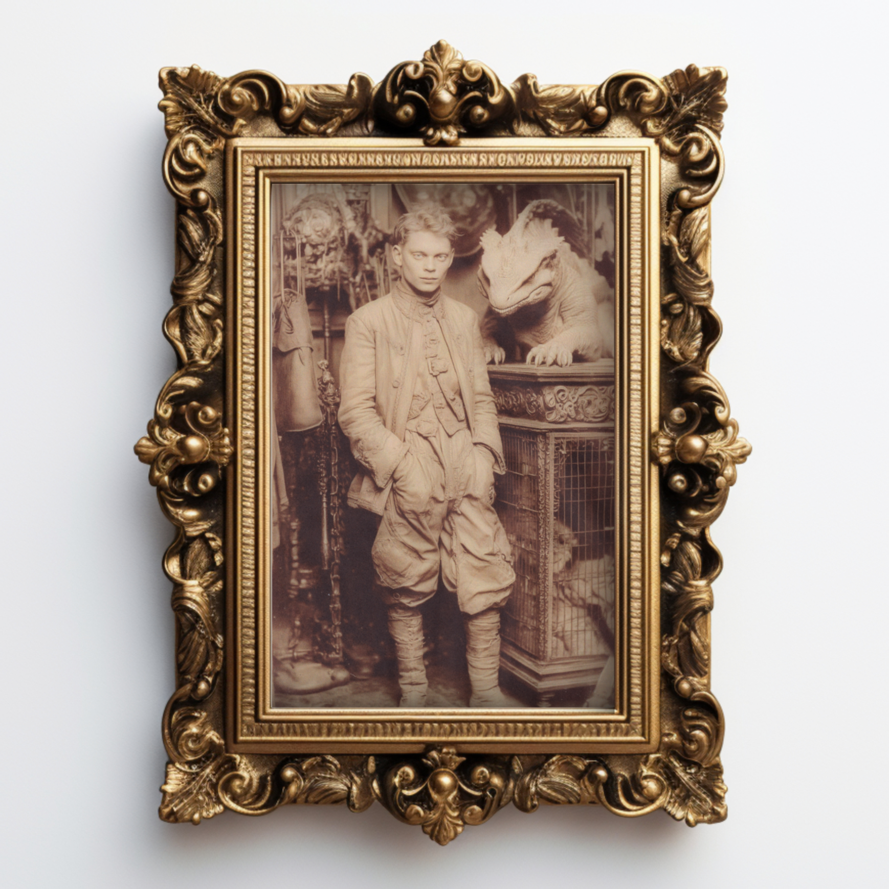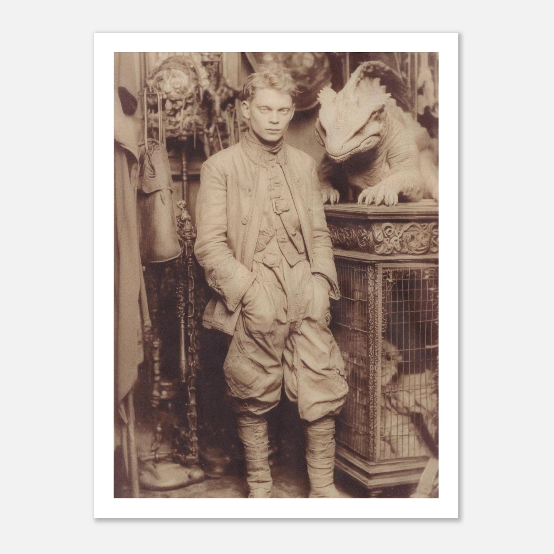 A Dragon Keeper in protective dragonhide clothing poses with a young Ridgeback, who is eying the photographer's boots with interest. He reportedly lost the boots, but kept all his fingers—making him something of a legend.